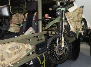 The Pioneer X can travel in electric mode for 80 km, the British Army requirement being 25 km. “In fact we over specified all requirements,” Ben Scott-Geddes noted. The on-board generator can also be used to provide electric power to external systems, for example ensuring power to a temporary combat outpost without the need to bring a proper generator, that would considerably reduce mobility and increase the fuel burden. It can also be used to load the batteries of unmanned ground or air vehicles as well as electric dirt bikes, one being visible on the right side of the vehicle exhibited at IAV.